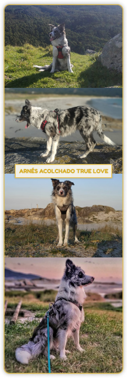 El siguiente arnés que pasamos a comprar fue el acolchado de la marca True Love. Buscábamos un arnés que además de tener las características del anterior tuviese asa, apertura en el cuello para ser más sencillo colocárselo y fuese barato. Sabíamos que no sería el arnés definitivo y de hecho quedamos tan contentos con el primero que tuvimos (color rojo), que luego repetimos compra con diferentes tallas (color gris y color marrón).